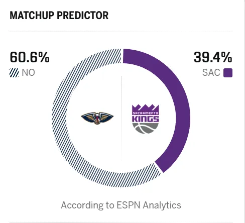 ESPN预测明日比赛:鹈鹕胜率60.6%,国王胜率39.4%